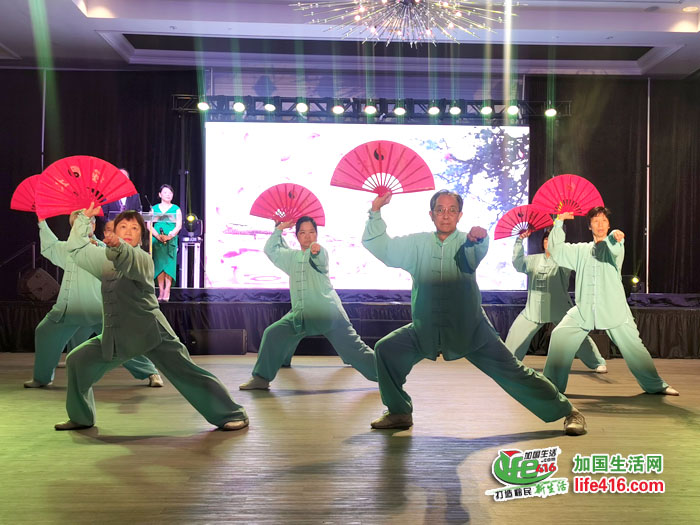 由太极师傅郭咏观医生带领多位学员表演精彩的太极功夫扇