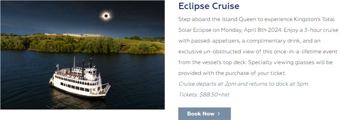 日食期间,如果你在Kingston,去千岛湖乘船游览看日食也是一种很好的选择。通常千岛游轮要到五月底和夏季的旺季才会开放,此次为了日食,Island Queen 号专门在2024 年 4 月 8 日星期一起航,乘船者可以全程享受3小时的游船之旅,除了可以享用开胃菜、免费饮料外,还可以到游船的顶层甲板一览无余地欣赏这一千载难逢的日全食盛事。当然了,船票包括提供专业观看日食眼镜。