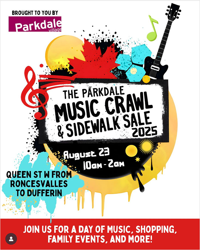 【加国生活网】这个星期六,多伦多市中心的Parkdale Village BIA 将举办 Parkdale Music Crawl 和 Sidewalk Sale!沿着 Queen St W 从 Roncesvalles 到Dufferin 将会热闹非凡,从上午 10 点开始,人行道上将举办适合所有年龄段的活动,包括家庭区、爵士乐队、DJ、街头艺人表演等等,人行道的各个商家还会提供各种商品和食品。入场完全免费,向所有人开放。