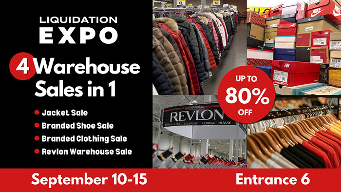 【加国生活网】本周末在International Center 举行有史以来第一次将四个特卖会销售集中在一个屋檐下的Liquidation Expo,包括夹克特卖(Up to 80% OFF)、品牌鞋特卖(Up to 80% OFF)、品牌服装特卖(所有全新品牌服装每件仅$20,但不包括西装外套和夹克)、Revlon露华浓特卖(Up to 75% OFF),这是大家在一个地方购买时尚、鞋类和顶级美容品牌无与伦比的优惠的机会,不容错过!
