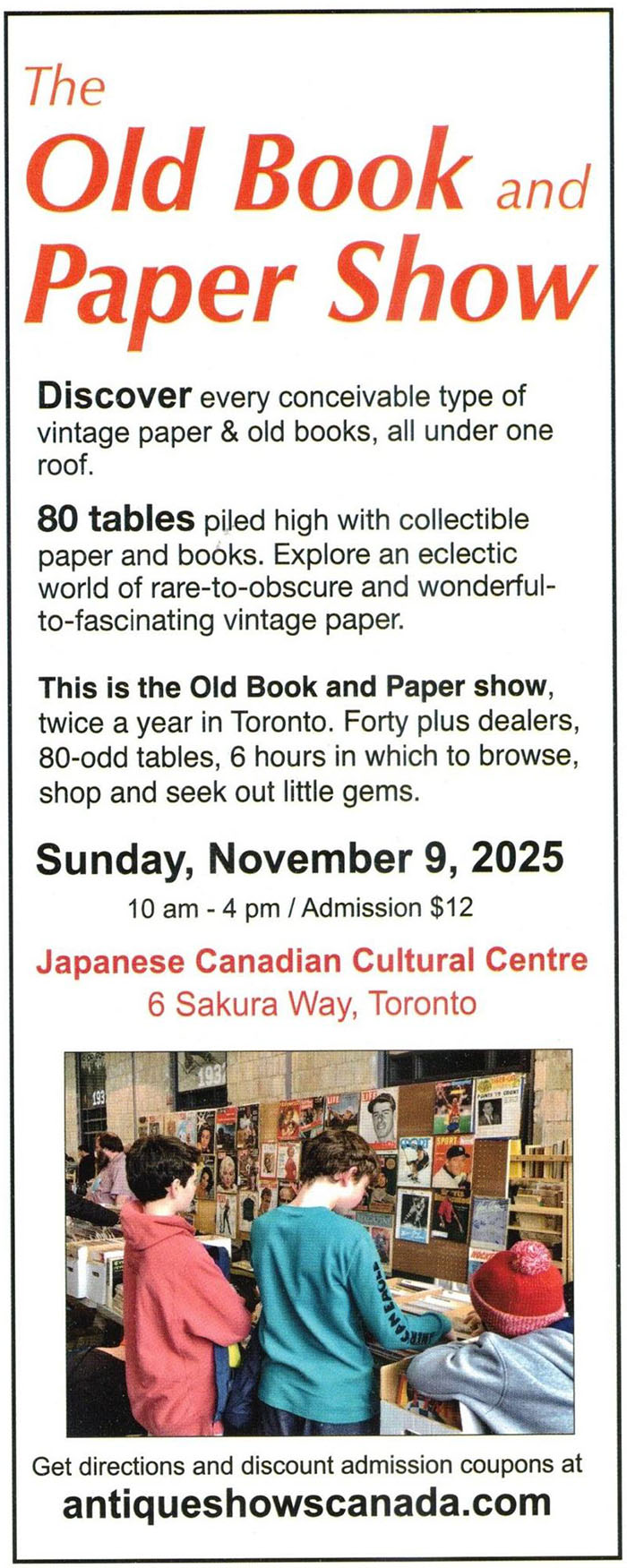 【加 国生活网】想在多伦多 “淘宝”吗?这个星期日,大多伦多地区最古老的纸张和古旧书展今年将在新地址 Japanese Canadian Cultural Centre 举行。如果你慧眼识货的话,还能找到某些著名小说的限量发行版或者是First Edition呢。要知道,收藏这些作品绝对比炒股票保险的多……票价:$12,12岁以下儿童免费。