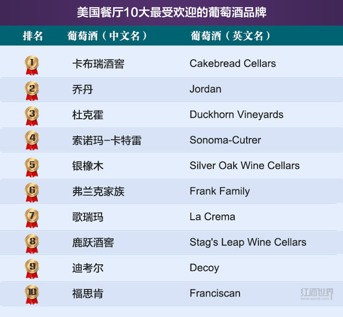 此次调查结果发表于《葡萄酒与烈酒》杂志上。每年,《葡萄酒与烈酒》杂志都会对美国餐厅最受欢迎的葡萄酒品牌进行调查。