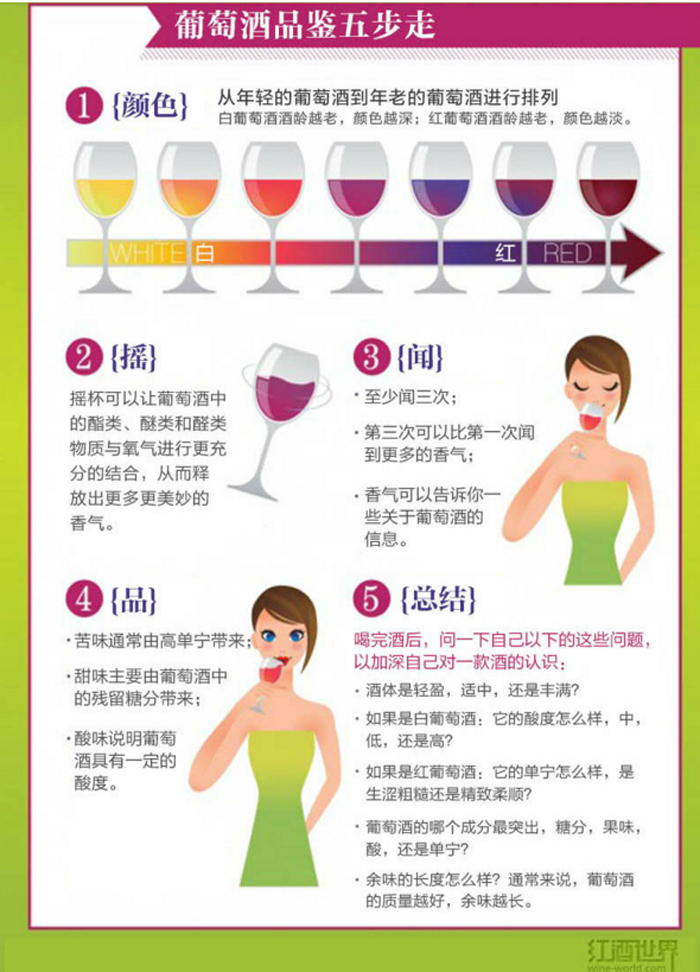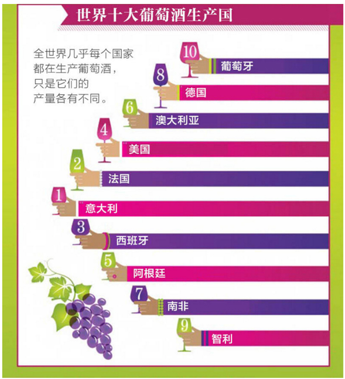 从下面的图片中,你可以一目了然地学会葡萄酒的各种风格、世界十大葡萄酒生产国、侍酒温度和葡萄酒品鉴步骤等方面的实用信息。