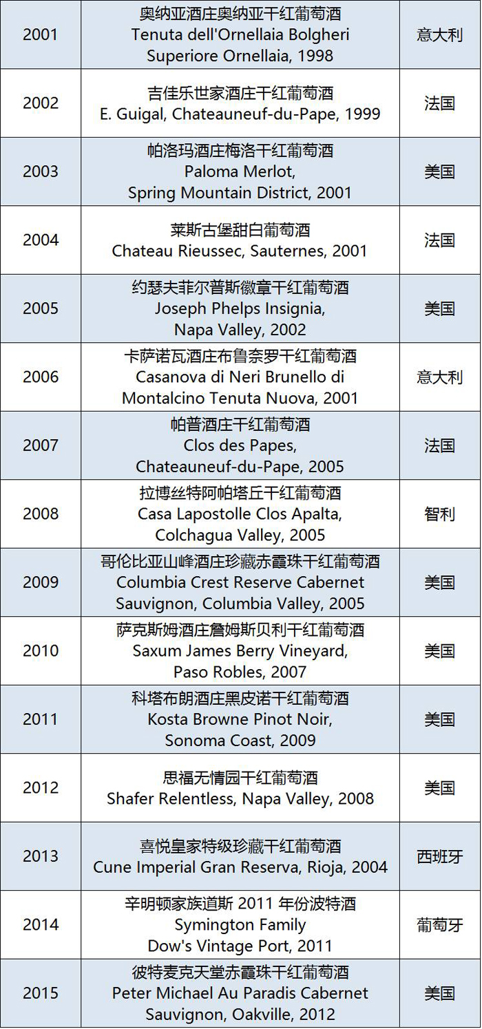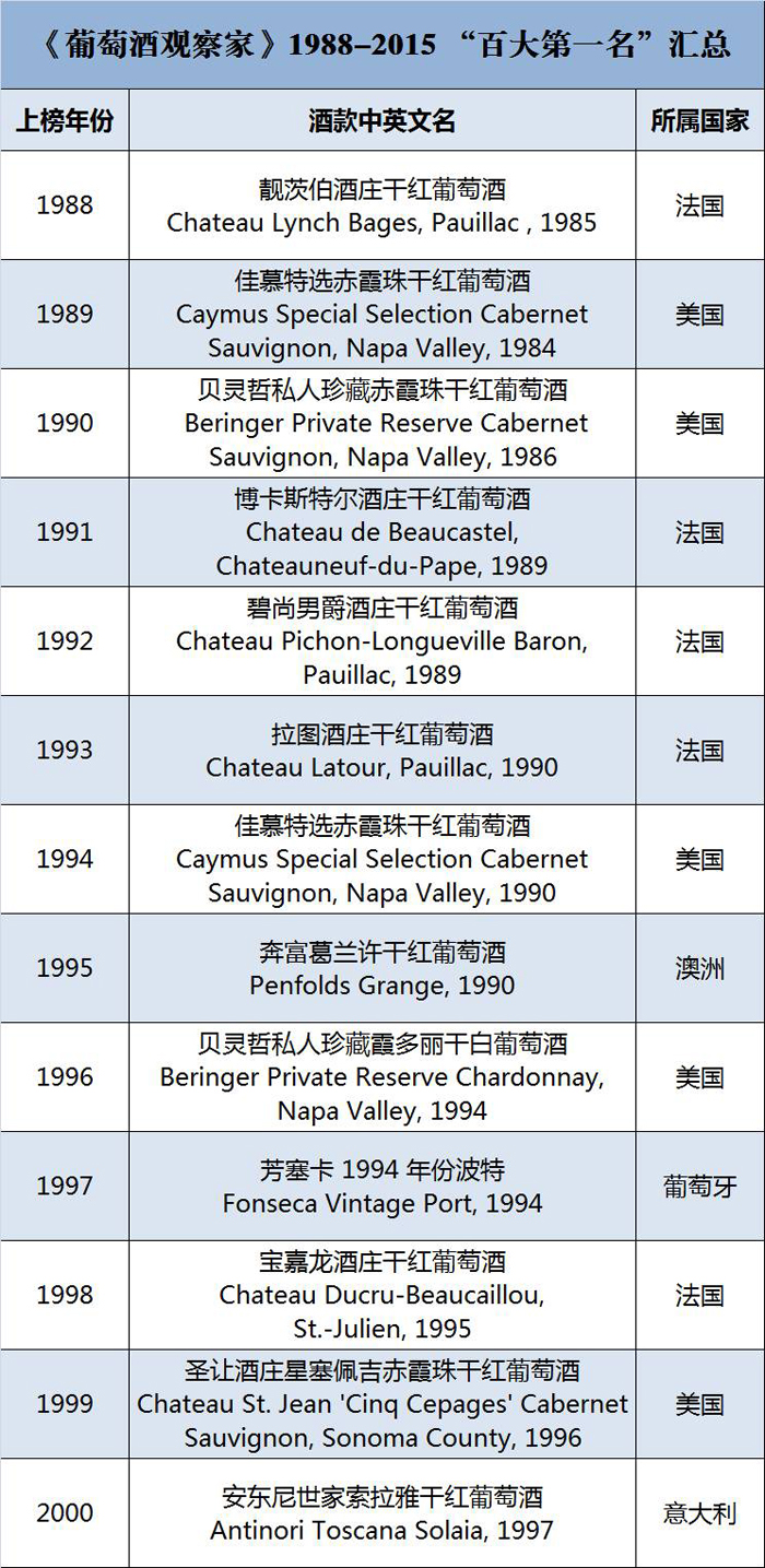 《葡萄酒观察家》(Wine Spectator,简称WS)始创于 1976年,一向是葡萄酒杂志中的权威,也是全球发行量最大的葡萄酒专业刊物。自 1988年起,WS杂志的编辑就开始品尝全球各大经典葡萄酒,并挑出最好的 100 款,著名的《葡萄酒观察家》百大排行榜由此而生。WS的评判标准主要基于质量(WS评分)、价值(价格)、可得性(根据葡萄酒的产量或者输入美国的数量)以及“X-因素”(兴奋度)。每年,WS都会从成千上万的葡萄酒中选取出最振奋人心且最具性价比的葡萄酒,对消费者而言极具参考意义,因此WS的百大排行榜也成为众多葡萄酒发烧友的选酒指南,尤其是位居榜首的葡萄酒更受酒友们青睐。那么,历年来WS百大葡萄酒冠军宝座都花落谁家了呢?