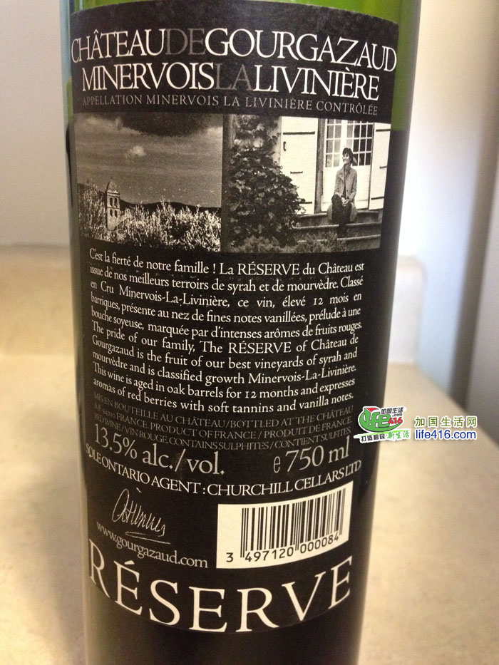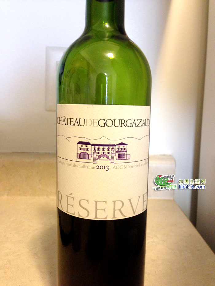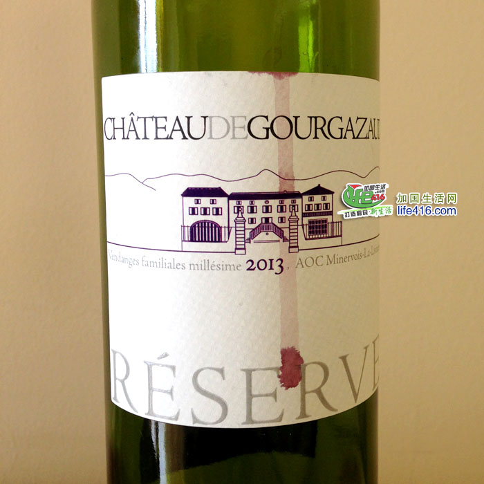 这是一瓶来自法国南部Minervois产区下的子产区La Liviniere酒庄Chateau de Gourgazaud的酒,竟然还是2013年的收藏款,是由西拉(Syrah)和慕合怀特(Mourvedre)混酿而成的,口感浓郁、入喉有黑巧克力加水果的甜香。