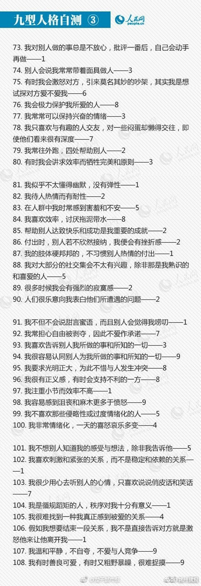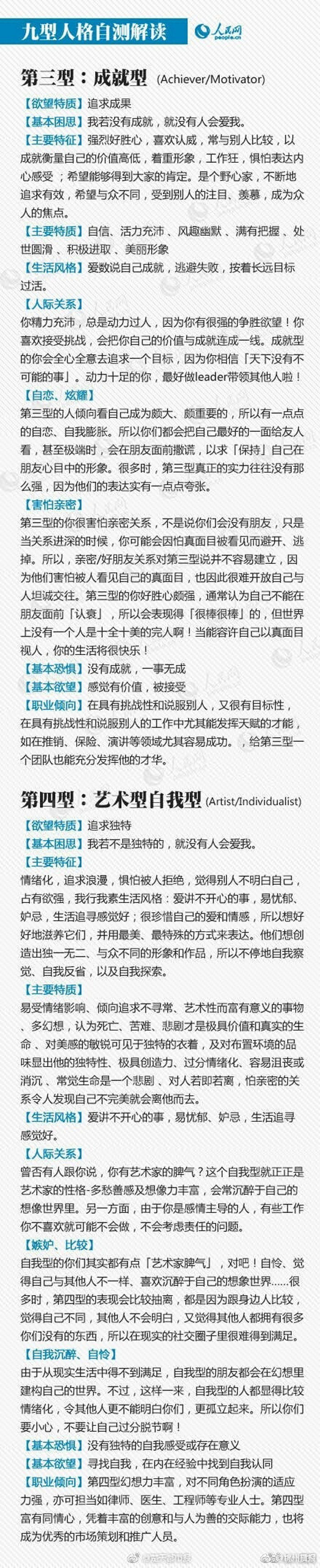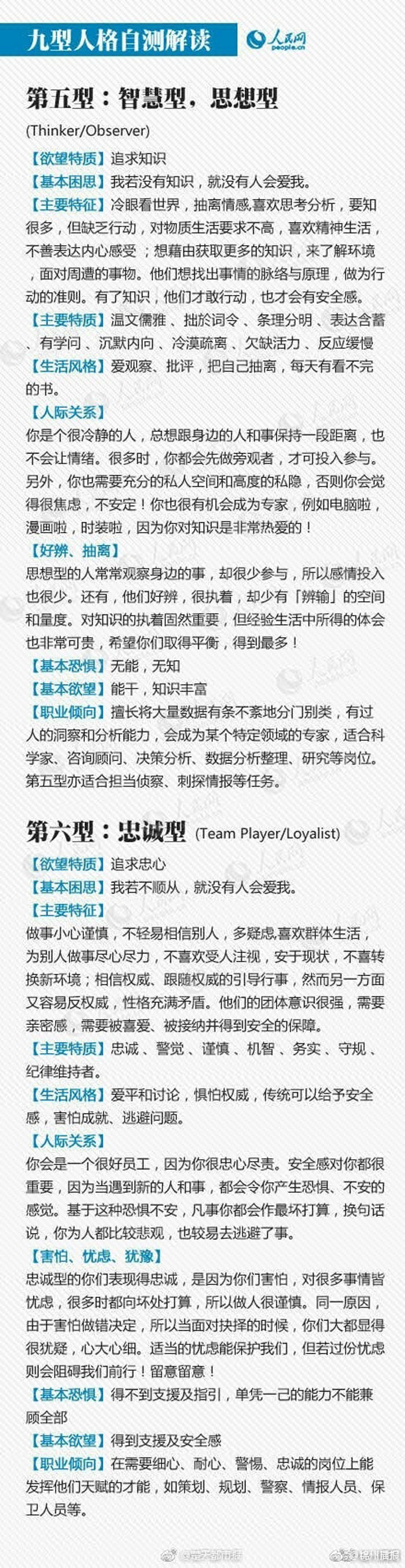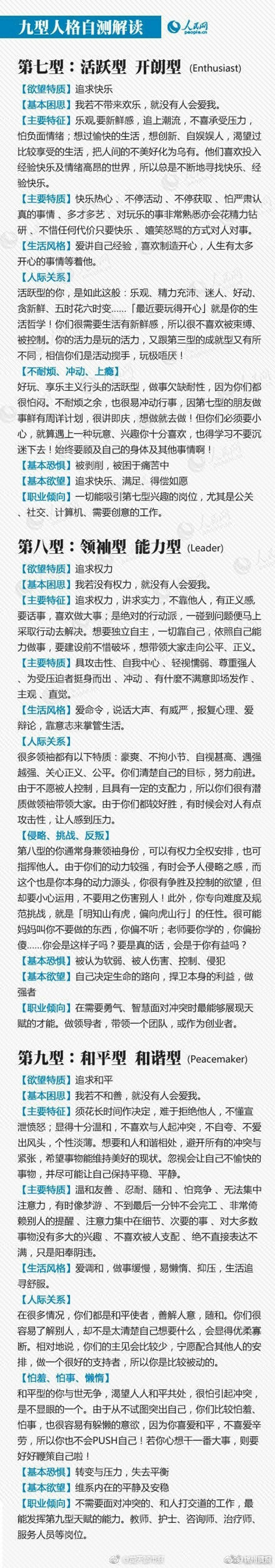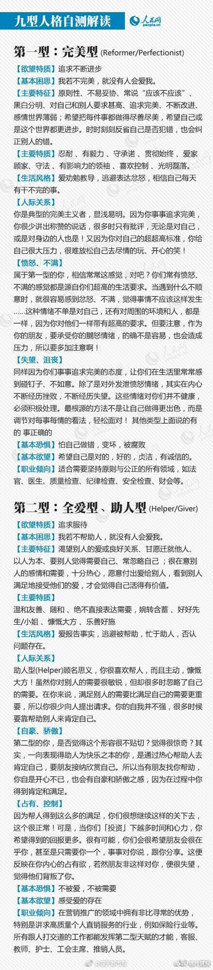 听说过“九型人格”吗?这是一种古老的心理分型理论,它将人的性格分为九种:①完美主义型;②助人型;③成就型;④自我型;⑤智慧型;⑥忠诚型;⑦快乐主义型;⑧领袖型;⑨和平型。你是哪一型?更好了解自己、规划前程!