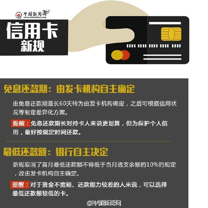 信用卡新规来了,这些变化很多人还不知道:①信用卡被盗刷可获得合理补偿;②透支利息有上限,最高每日万分之五;③免息还款期或超60天…新规2017年1月正式实施。信用卡该怎么选?账单日怎么设置?万一盗刷该咋办?信用卡攻略速速收藏!