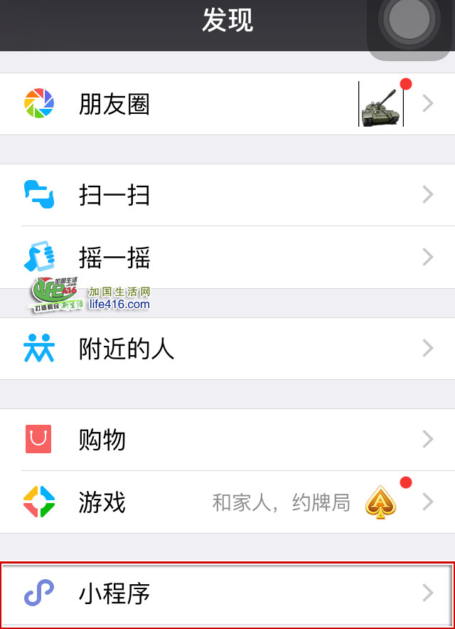 6、退出后你再到“发现”这个界面,会发现在“游戏”那一项下面多出了一项,即“小程序”