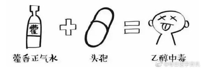 藿香正气水中含有40~50%的乙醇,酒精在体内代谢生产为乙醛,而头孢类药物会抑制乙醛在体内的代谢,造成乙醛蓄积,引起中毒,严重时可诱发急性肝损害、呼吸暂停甚至死亡。