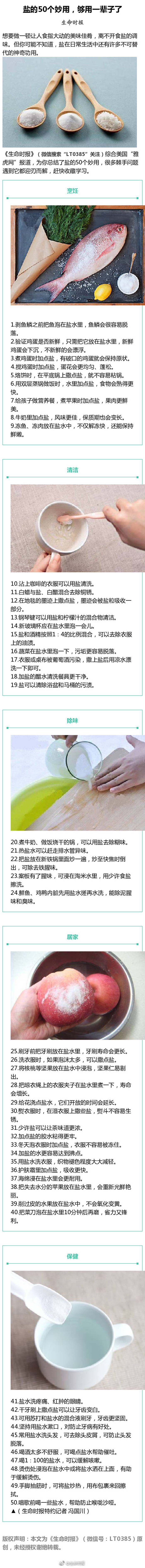 想要做一顿让人食指大动的佳肴,离不开食盐的调味。但你可能不知道,盐在日常生活中还有许多不可替代的神奇功用。《生命时报》综合多方报道,为你总结了盐的50个妙用,很多生活棘手问题遇到它都迎刃而解,赶快收藏学习。