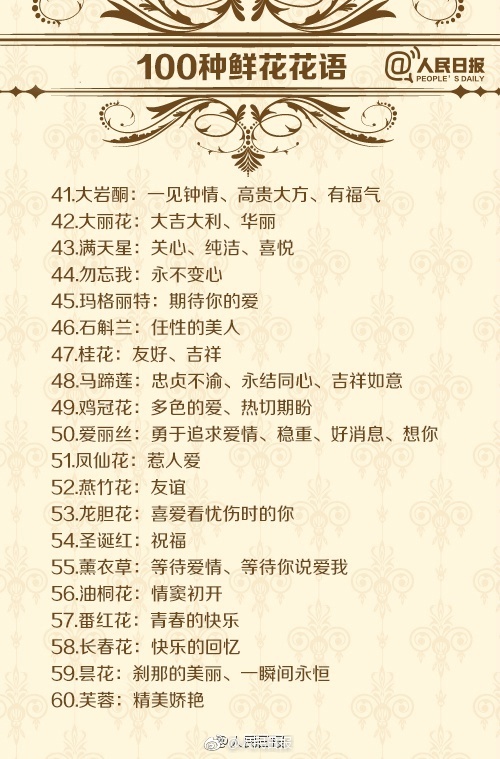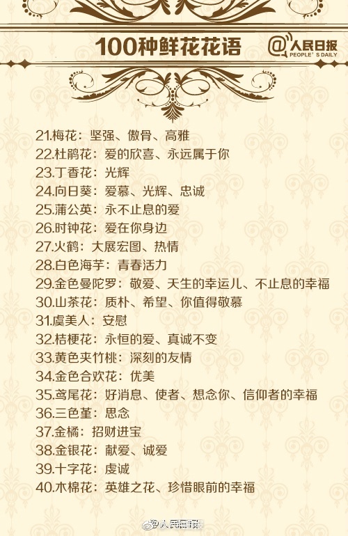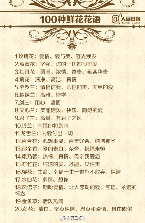 文章来源:人民日报-新浪微博【果断收藏!100种鲜花的花语,七夕送花就用它!】花有“花语”,不同的花代表不同的含义。送花、赏花,懂花语,表达的情感甚于言语。玫瑰花、百合花、郁金香、康乃馨、满天星、勿忘我…各种常见的鲜花都是什么意思?送花的朵数又代表什么含义?戳图对照↓↓七夕快到了,收藏学习!