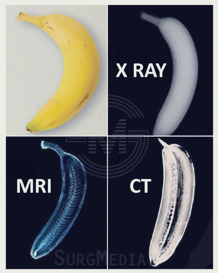 CT就像把香蕉切成片来看,显示体内出血、钙化、骨骼、空气以及脂肪更有优势;