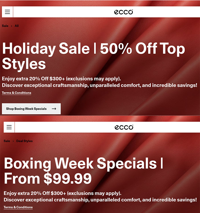 加拿大ECCO鞋店在今年的促销力度很大,全店许多产品都是50% off,而不是以前的Up to 50% Off,而且超过$300还有额外20% off的优惠,更多打折信息请到官网查询:https://ca.ecco.com/sale/all