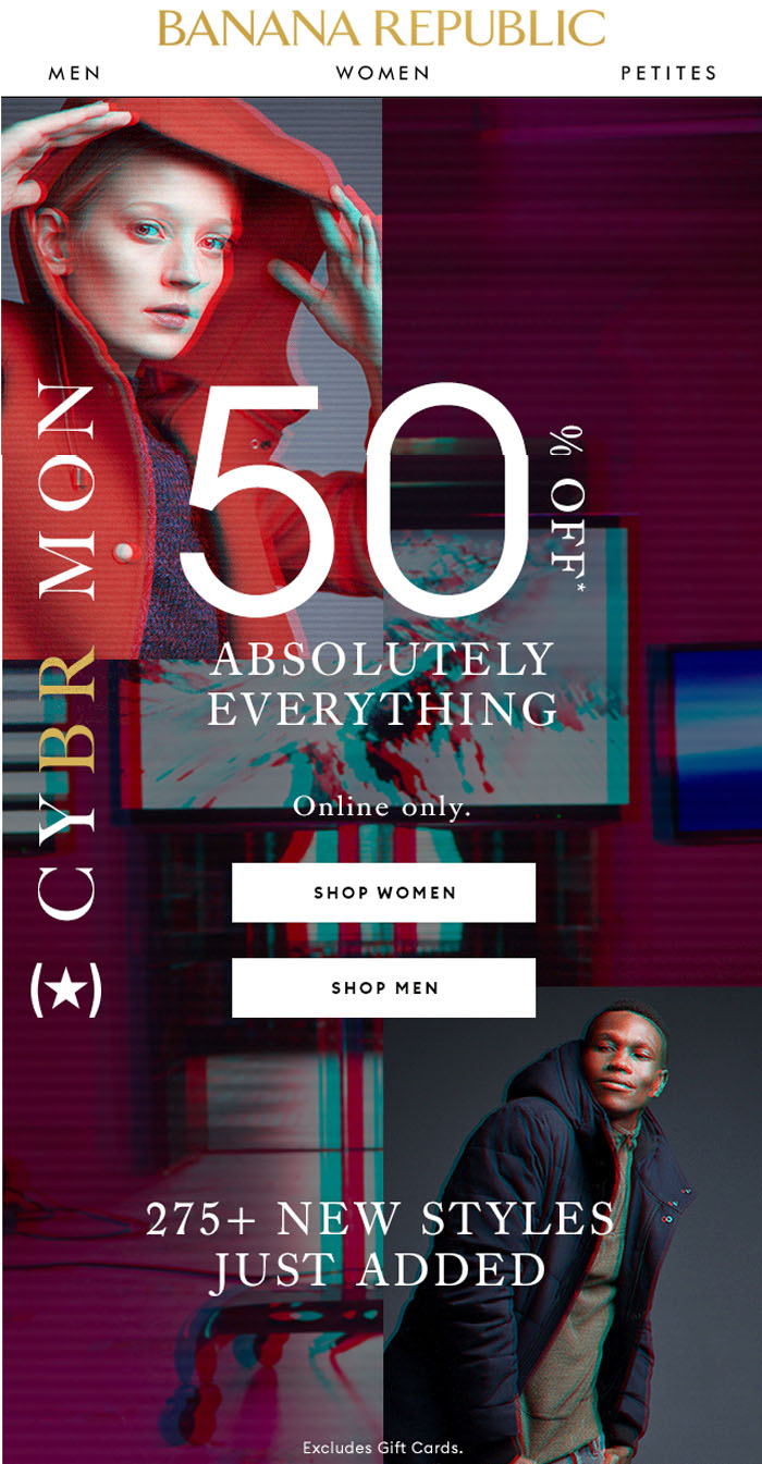 Banana Republic Canada Cyber Monday Deal:网店有50% OFF的优惠,包括275种最新款式。结帐的时候不需要输入促销代码,会自动显示优惠的价格。