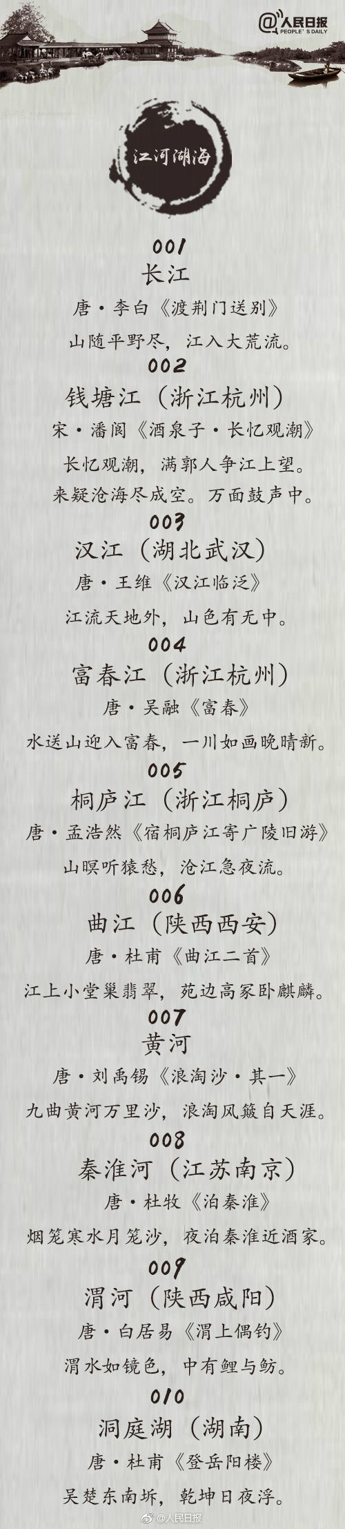 悠悠文明,中华大地。每一寸河山,都饱含着文人们的诗情画意。“会当凌绝顶,一览众山小”是写哪座山?“江流天地外,山色有无中”是指哪条江?“晴川历历汉阳树,芳草萋萋鹦鹉洲”说的是哪座名楼?…#清明#小长假,诵读85句经典诗词,带你游遍大美中国!