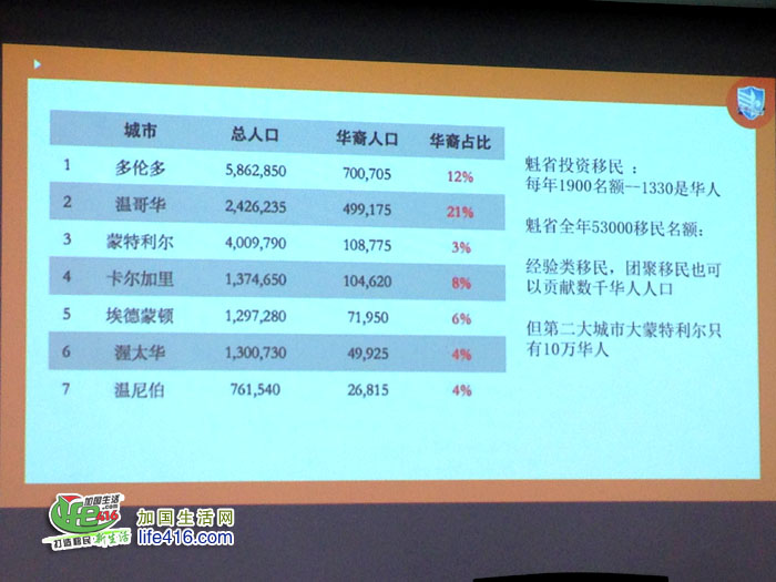 说明会中,主持人Roger首先介绍了魁省宽松的政策、优越的福利以及魁省华人的现状。他提到每年魁省有诸多的华人移民,同时也有大批华人移民移居安省和BC省,作为400万人口的大蒙特利尔只有10余万华人,究其原因就是华人群体对法语不够重视。