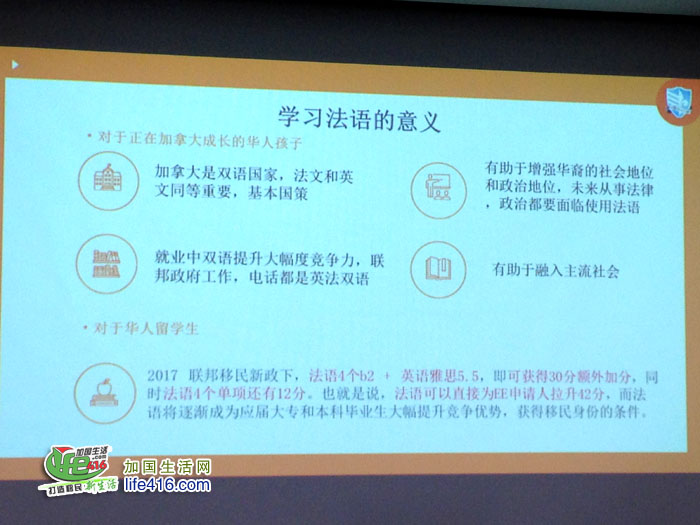 同时,法语作为规避激烈的移民甄选竞争的有利工具,曾剑芬女士也就联邦移民快速通道EE以及安省法语特殊人才项目,回答了与会留学生和新移民的问题。EE中30分的法语加分以及快捷的安省法语人才项目引起了与会者的极大兴趣,如果能利用闲暇时间掌握法语,不仅可以顺利移民还能够为未来在加拿大安居乐业早做准备。