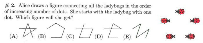 我第一遍看这个题目的时候有点懵,我理解的意思是,“找一只瓢虫画线,依次穿过每只瓢虫”,按照我的这个理解,似乎所有选项都是对的 … 后来再仔细看题目、看图案,我才发现,原来每只瓢虫身上都有圆点,而圆点的数量也各不一样,因此文中强调了一句“in the order of increasing number of dots”,必须要理解这句话,才能明白需要根据圆点的数量来连接瓢虫的道理。这题的答案是D。