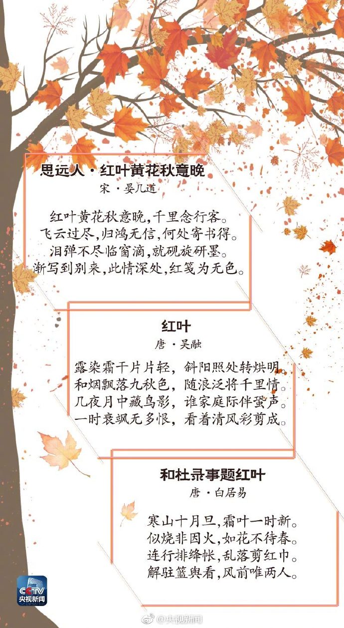 秋意渐浓,正是观赏红叶的好时节。在古诗词中,红叶是“霜叶红于二月花”的艳丽,是“天然妆点秋屏列”的缤纷,是“冉冉秋光留不住”的怅然,是“孤梦家山远”的乡愁…一起读这些唯美诗词↓↓品诗意,赏秋光。