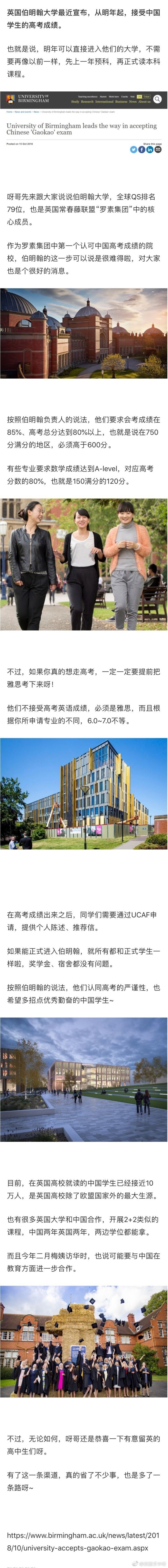 英国罗素联盟的核心成员伯明翰大学 从明年起接受中国高考成绩了