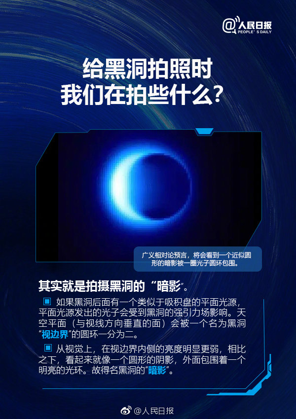 【天文学家捕获的首张黑洞照片公布】该黑洞图像揭示了室女座星系团中超大质量星系 Messier 87中心的黑洞。该黑洞距离地球5500万光年,质量为太阳的65亿倍。图中心的暗弱区域即为“黑洞阴影”。 (文字和图片来源@中科院之声)