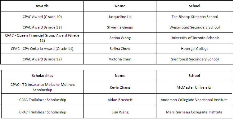 本次CPAC基金会将颁发三个类别共计八个奖项,它们分别是: CPAC-TD Insurance Meloche Monnex奖学金获奖者一名,奖励3000加元;CPAC先锋奖学金获奖者两名,各奖励3000加元;CPAC、CPAC- Queen Financial Group以及CPAC - CPA Ontario高中奖学金获奖者五名,各奖励1000加元;八个奖学金总价值14,000加元。