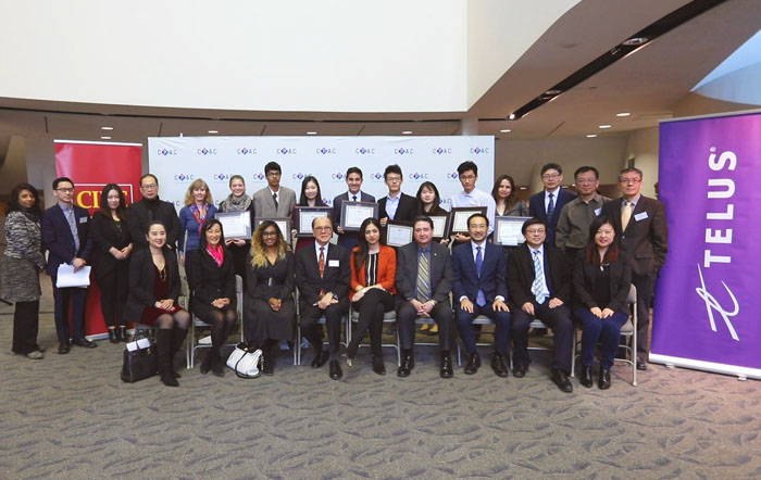 获奖学子与CPAC基金会理事、捐助人、赞助商代表在第十届CPAC‘教育日’上合影(第一排左起:CPAC基金会理事、赞助商HUM律师事务所创办人Lai-King Hum、CPAC基金会理事Karen Webb、CPAC奖学金捐款方CPA Ontario代表Patricia Eddu、CPAC基金会会长林瑞铭(Richard Lim)、第十届CPAC教育日活动主题赞助商TELUS代表Sarah Adnan、CPAC奖学金捐款方TD Insurance Meloche Monnex代表Jorge Cardelus、 CPAC会长肖楚强(Eric Xiao)、CPAC奖学金捐款方Queen Financial Group董事长蒋志成(Charles Jiang)、赞助商CIBC代表Nancy Xiu;第二排左六起:CPAC教学金获奖学生Carmen Bezner Kerr , Hshmat Sahak, Jing Xuan(Jessica) Miao, Jason Alaee, Alvin Li, Ying-Chia (Christina) He, Jehwan(Dennis) Bae, Pardis Balari的妈妈)