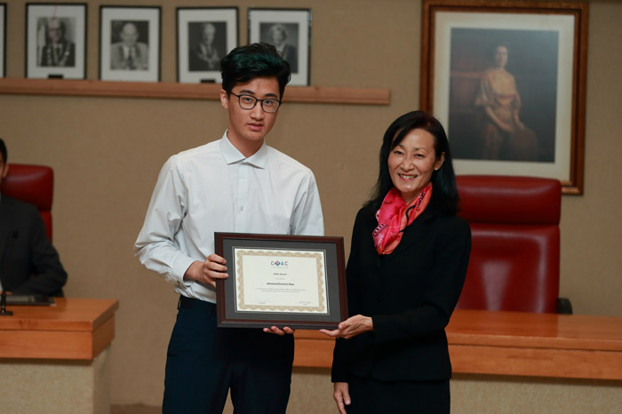 CPAC基金会理事Karen Webb(右)为CPAC高中奖学金获奖者Dennis Bae(左)颁奖