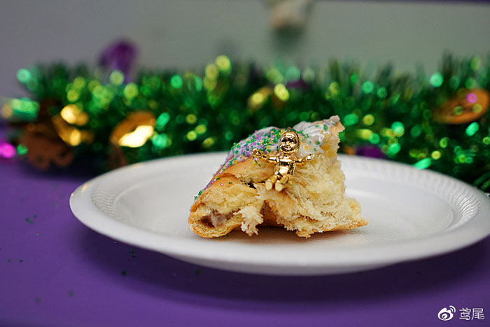 除了啤酒,狂欢节的传统食物是King's Cake国王蛋糕。每个国王蛋糕里都会藏有一个婴儿玩偶。吃到小人的那个人就是当天最幸运的人。而他就是下次King Cake Party的主办人。这个是来自于三王朝圣耶稣的典故,算是仅存的宗教意味了吧。有些像中国人过年包饺子里的硬币。