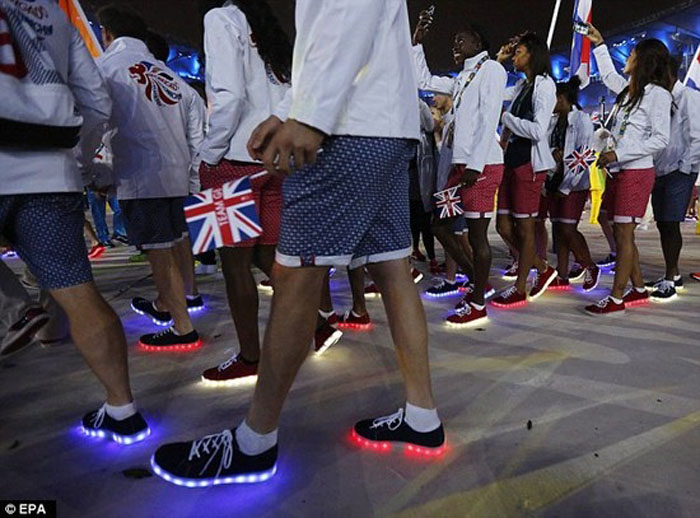 在整个闭幕式进行的过程中,英国代表队的发光运动鞋竟然抢镜成功,走红网络。为庆祝英国代表团海外参赛成绩最好的一届奥运会,成员将穿着发光鞋登上闭幕式的跑道。阿克宁顿的设计师表示,他们设计的USB充电发光鞋是受到了里约热内卢狂欢精神的启发。