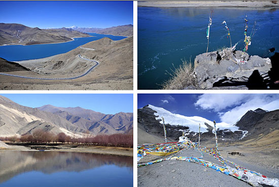 右上水葬台;左上羊卓雍措湖;左下前往俊巴村的路上;右下乃钦康雪山
