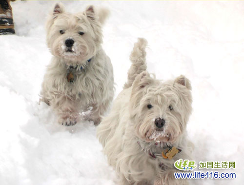 到Edwards Garden赏雪景的人还不少呢,这两位加拿大当地人就住在附近,带着两条狗到这里散步。他们说,他们在多伦多生活了那么久,第一次看到这么漂亮的雪景。