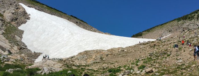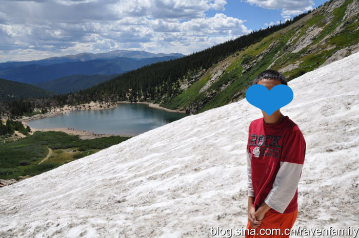 宝贝一家从没见过冰川,今年夏天宝贝爹设计的旅游路线就带我们一家人去看了美国最南面的冰川----St. Mary's Glacier(圣玛丽冰川群)。下面这张照片是俺家宝贝爹用手机的什么功能照的宽屏相片,这是在近山顶的地方的圣玛丽湖和边上的冰川。7月哎,山下还是有20多度的,山上却是积雪不化,在山上宝贝妈咪看到一部分人是背着雪橇和滑板来的,显而易见这里可以滑雪,即便是夏天。宝贝妈咪觉得,应该是山体下面是永冻土,所以山上可以有积雪。山下的湖应该是雪水融化而成,冰凉刺骨,但也清澈见底,非常漂亮。