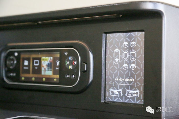 商务舱舷窗是电动调节(经济舱可以没有哦),不仅在窗户上有按钮,在扶手侧面的空中面板上还有多功能液晶屏控制舷窗的开启闭合。