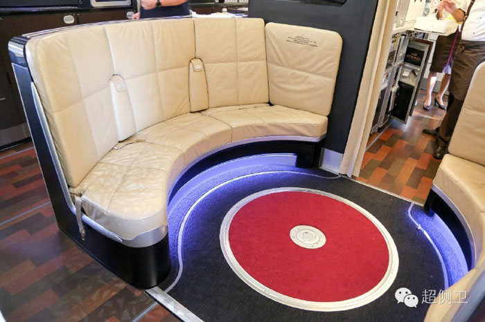 在头等舱和商务舱之间有一个豪华休息室,设有两个舒适的皮质沙发,配有服务员的吧台供应热食小点和饮料。