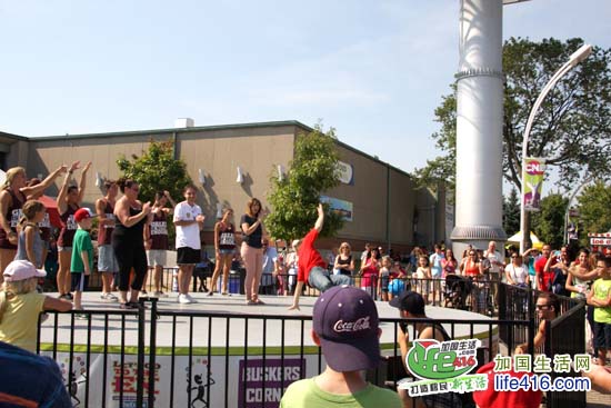 在这个小小的舞台上,主持人欢迎五个观众加入表演,加拿大人还真是很大方的,随便加入的五个人跳舞跳得都不错哟,这个小伙更是玩起了拖马斯全旋的高难度动作。