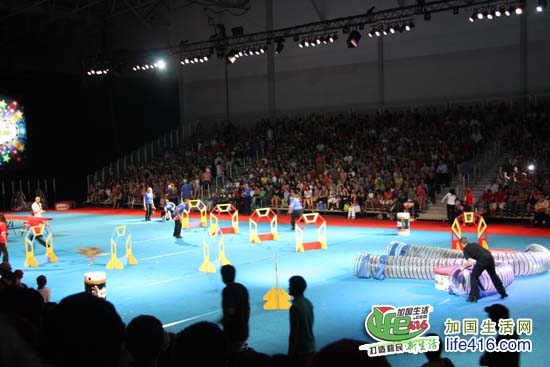 不看表演你就不会知道,这些狗狗们有多……么……聪明哟。这个表演是两队狗狗进行穿圈长跑接力赛,两队狗狗分别代表两边的观众,每一边的观众都为自己这一边的狗狗加油,现场的气氛相当地热烈。