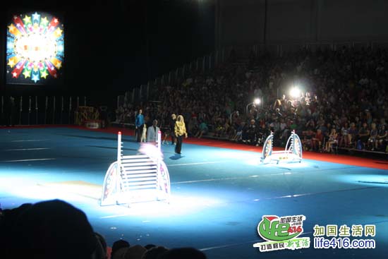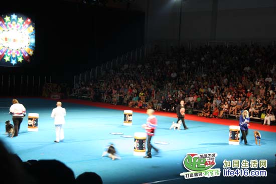 这个表演类似抢椅子游戏,不同的狗狗代表加拿大不同的冰球队,主持人一声令下,狗狗就要跑到座垫那里坐下,没抢到座垫的狗狗就下场。有意思的情节是,每当一个狗狗下场,就有另外一只狗狗从后台跑出来,把一个座垫叨走,现场爆笑声不断啊……