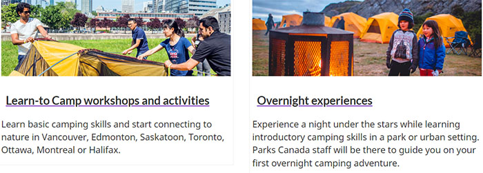 Parks Canada将Learn to Camp活动分成“Learn-to Camp workshops and activities” 和 “Overnight experiences” 两个部分: