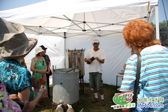 主人旁边的那个大的不锈钢罐子就是将收割下来的薰衣草制成精油和花水的仪器,经过高温蒸馏处理后,通过长长的管子后流到瓶子里,上面那一层就是薰衣草精油(Essential Oil),下面的水就是薰衣草水(俗称花水Hydrosol)。之后,农场还会将这两个产品分离并去杂质,最后变成成品精油和花水出售。主人很自豪地说,这个加工仪器还是他自己手工制作的呢,加拿大的男人许多都是这样心灵手巧外加能干的,呵呵。
