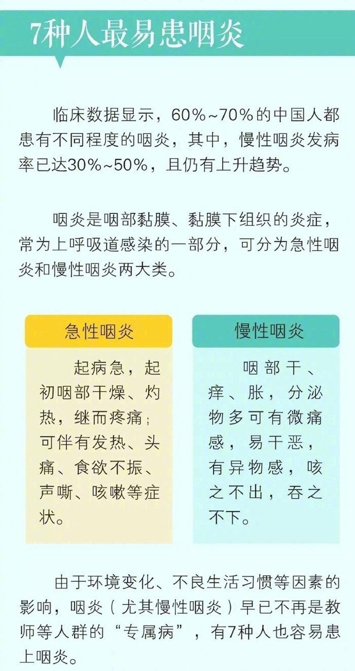 喉咙干痒;刷牙时常感到恶心;嗓子有异物,咳不上来,咽不下去……如果出现这些情况,你可能是被咽炎盯上了。空气污染、久吹空调,让一半多中国人受到咽炎困扰。《生命时报》采访专家,还你一副清爽、舒适的嗓子。