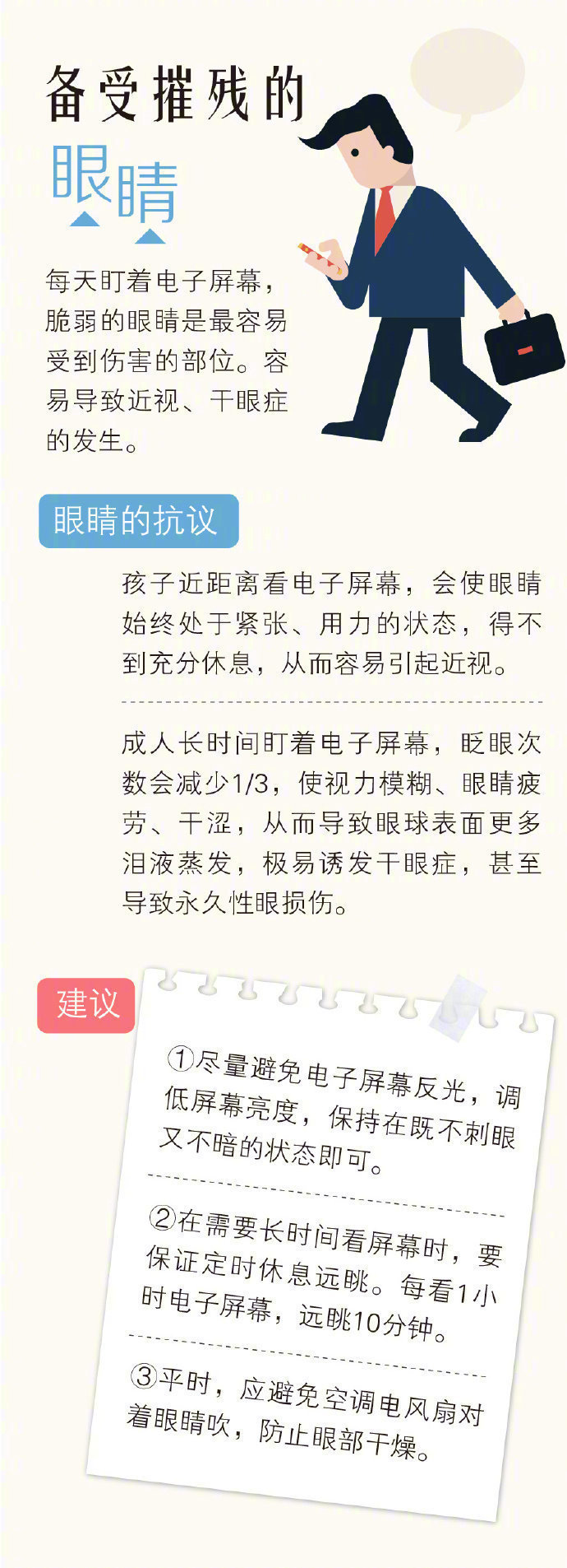你的一天,或许是抱着手机、电脑、Pad度过的。在这个时代,我们几乎被屏幕“包围”。在提供便利的同时,它们也偷偷带走了你的健康。过度使用电子屏幕,究竟会给身体造成哪些伤害?六张图告诉你答案。