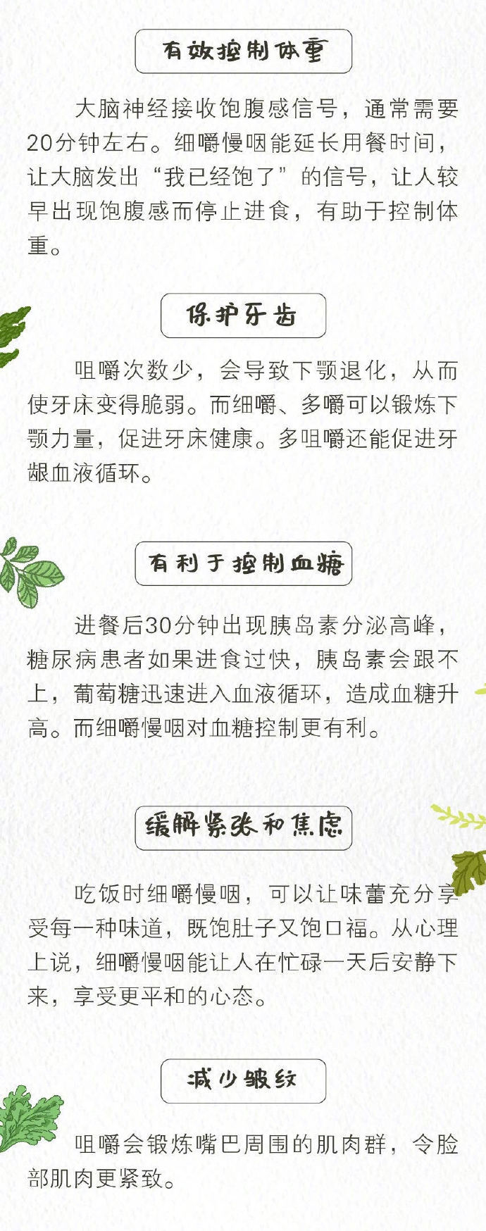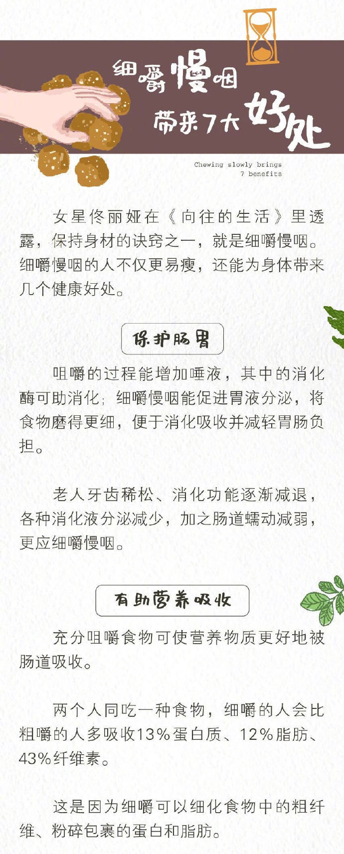 你吃一顿饭需要多久?40多年前,每餐咀嚼900—1100次、用时20—30分钟,而在快节奏的当下,每餐咀嚼500—600次、用时5—10分钟。佟丽娅在《向往的生活》里透露,保持身材的诀窍之一,就是细嚼慢咽。吃饭慢的人不仅更易瘦,还能为身体带来健康好处。
