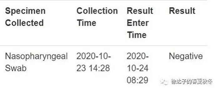 上车前,把口罩、浴帽全扔了,消毒双手、手机,回到家,外套裤子扔到后院先晒晒再洗,马上洗头、洗澡,接着就上网去查询结果了。第一遍查询,显示已经ordered,第二天早上起来赶紧打开电脑再查,嘿,正如网友们所说,医院检测点比药店检测点出结果要快,十二小时结果就出来了!如自己自检及猜测的一样,Negative!阴性!这下彻底放心了,开心!撒花!!