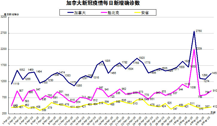 加国生活网小编统计了从4月1日至5月6日每日新增确诊数,制作了如下曲线图,分别统计了全加拿大(蓝色)和确诊数最多的两个省魁北克省(粉色)和安省(黄色)三组数据,大家可以了解一下进行4月份以来加拿大新冠疫情的发展趋势。加拿大、魁省和安省在5月6日新增确诊数均小幅上升,安省又上升到400以上!