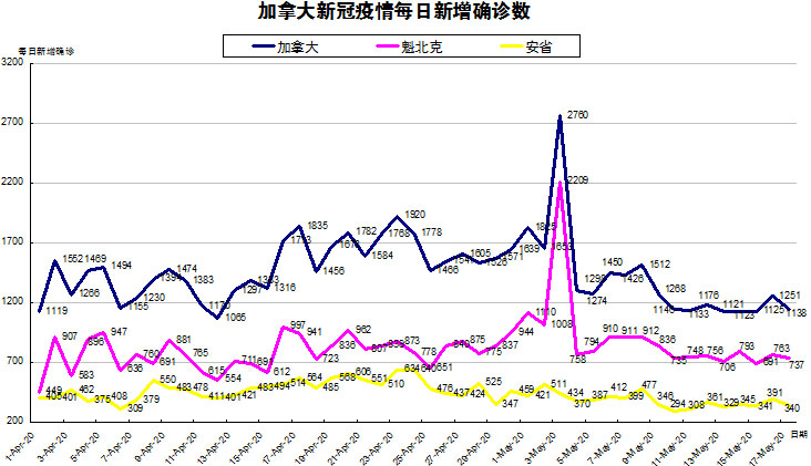 加国生活网小编统计了从4月1日至5月17日每日新增确诊数,制作了如下曲线图,分别统计了全加拿大(蓝色)和确诊数最多的两个省魁北克省(粉色)和安省(黄色)三组数据,大家可以了解一下进行4月份以来加拿大新冠疫情的发展趋势。加拿大、魁省、安省在5月17日新增确诊数均有一定程度的下降,而纵观安省这一周的数据,都是在300多上下浮动,较之前一直在400-500左右浮动有所下降。