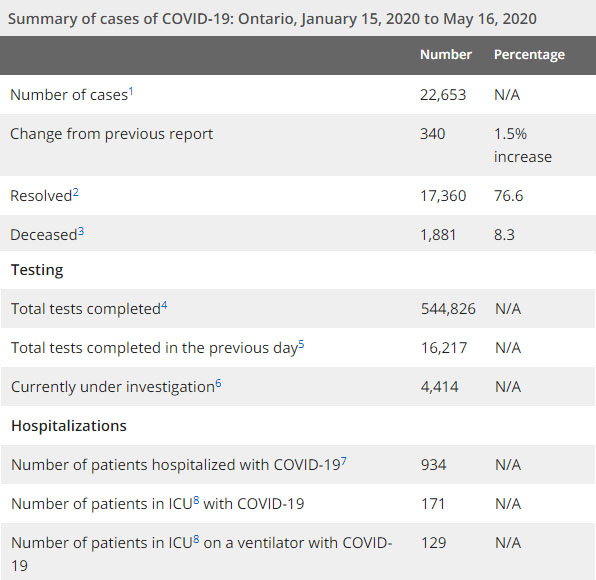 安省方面,截止5月16日上午10:30点,安省已对544826行了新冠病毒检测(检测数较昨天新增16217例),还有4414处于被调查阶段。确诊总数22653(较昨天上升340,确诊率下降到2.1%),包括17360例康复(康复率达到76.6%)、1881例死亡(截止5月17日死亡又增加到1986例,这是CBC统计的最新死亡数据,死亡人数较昨天增加25例,死亡率仍8.8%,但仍是加拿大死亡率最高省份)、住院患者934例(减少41)、进入ICU患者171例(减少9)、ICU插呼吸机患者129例(减少6)。
