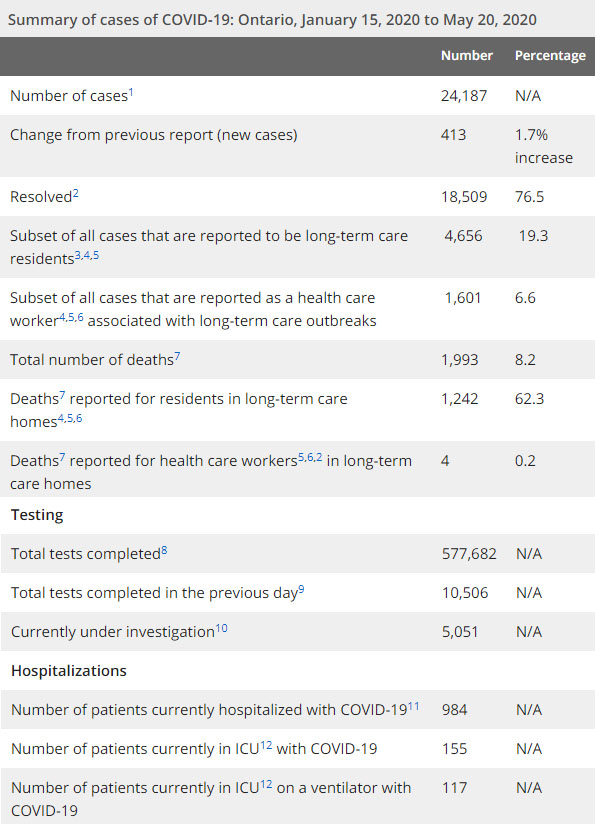 安省方面,截止5月20日上午10:30点,安省已对577682行了新冠病毒检测(检测数较昨天新增10506例),还有5051处于被调查阶段。确诊总数24187(较昨天新增413,确诊率下降到3.9%),包括18509例康复(康复率达到76.5%)、1993例死亡(截止5月21日死亡又增加到2091例,这是CBC统计的最新死亡数据,死亡人数较昨天增加24例,死亡率又降至8.6%,且仍是加拿大死亡率最高省份)、住院患者984例(减少7)、进入ICU患者155例(减少5)、ICU插呼吸机患者117例(减少3)。