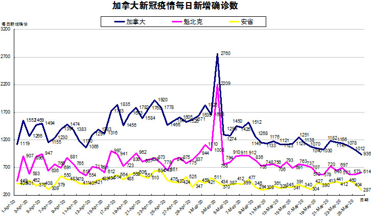 加国生活网小编统计了从4月1日至5月26日每日新增确诊数,制作了如下曲线图,分别统计了全加拿大(蓝色)和确诊数最多的两个省魁北克省(粉色)和安省(黄色)三组数据,大家可以了解一下进行4月份以来加拿大新冠疫情的发展趋势。魁省在5月26日新增确诊数均有上升,而加拿大和安省则有所下降,特别是安省,虽然终于又低于300以下了,但小编实在是不知这个数值能保持几天,因此就算看到这个287,也高兴不起来。