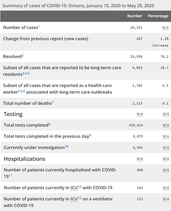 安省方面,截止5月25日上午10:30点,安省已对629414行了新冠病毒检测(检测数较昨天新增9875例),还有6961处于被调查阶段。确诊总数26191(较昨天新增287,确诊率下降至2.9%),包括19958例康复(康复率上升至76.2%)、2123例死亡(截止5月26日死亡又增加到2219例,这是CBC统计的最新死亡数据,死亡人数较昨天增加25例,死亡率仍为8.5%,目前魁省死亡率也是8.5%)。好消息继续保持的是:住院患者848例(减少11,本月已继续三天低于900例);进入ICU患者143例(减少5);ICU插呼吸机患者113例(减少1)。